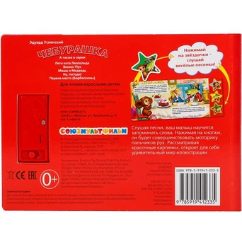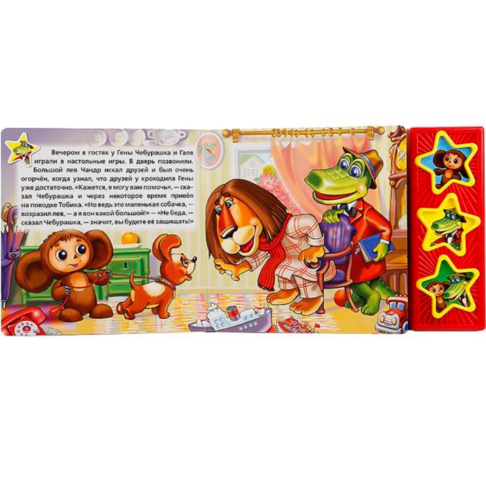 Книга посвящена известным российским мультипликационным персонажам — Чебурашке и крокодилу Гене. Друзья ходят в гости, развлекаются и просто весело проводят время. Родители могут зачитывать занимательную историю, в то время как малыш будет обогащать свой словарный запас, воображение и память, попутно с интересом разглядывая красочные картинки из книги. Текст адаптирован для самых маленьких читателей. Книжка небольшого размера, ее очень удобно держать в руках. Странички изготовлены из плотного картона, так что помять или порвать ее будет не так просто. В издании имеются звуковые кномпи в виде звезд, нажав на которые, можно послушать песенку из мультфильма и услышать голоса любимых героев. При повторном нажатии на кнопку песенка останавливается. Такую кни