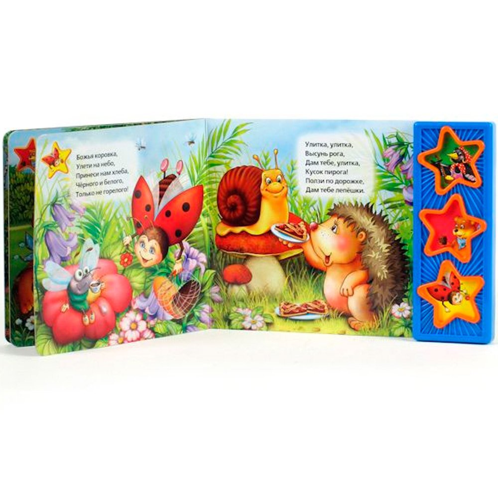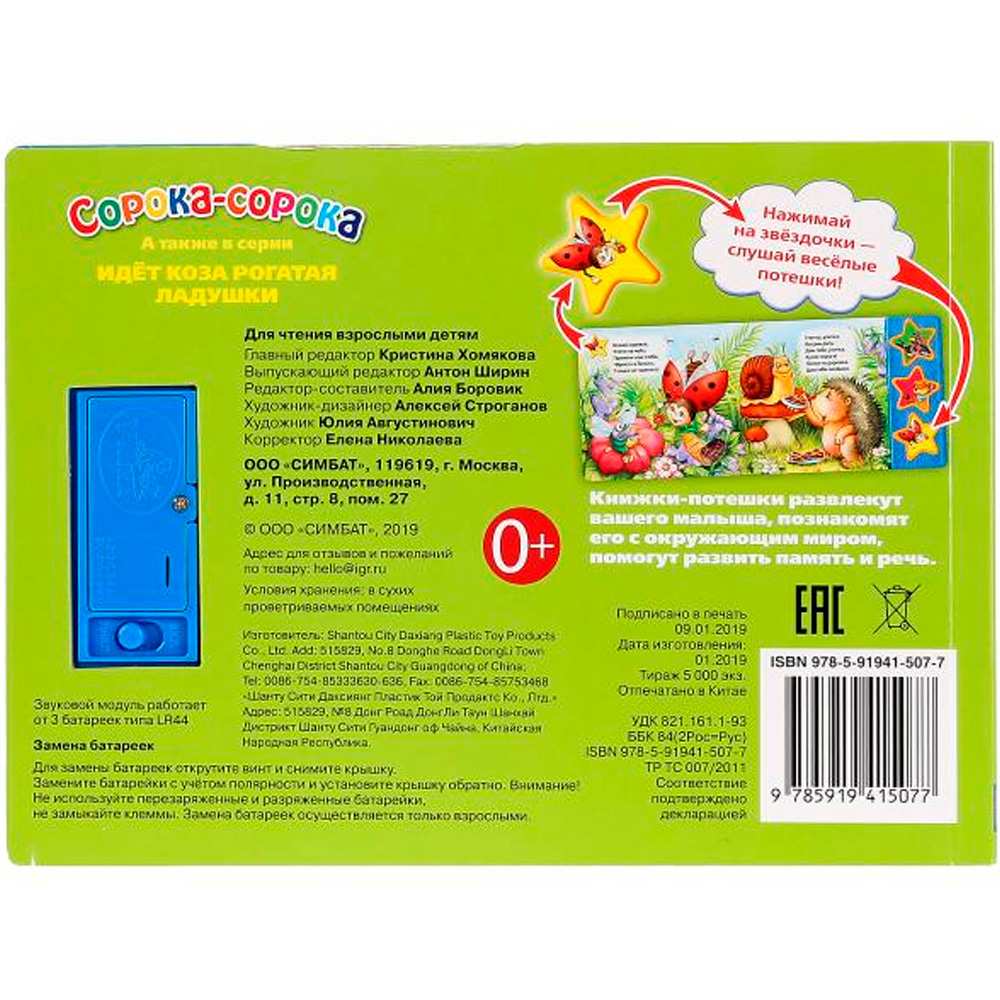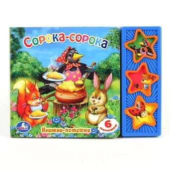 Книжка с вырубкой "Сорока-сорока" содержит веселые стихи и потешки для самых маленьких. Книга снабжена яркими красочными иллюстрациями. Книжка небольшого размера, ее очень удобно держать в руках. Издание имеет безопасный и удобный формат. Нажав на кнопки в виде звездочек справа, можно послушать фрагменты забавных песенок и голоса животных. В самой книге имеются подсказки в виде изображения на кнопке, следуя которым можно услышать соответствующую песню. Чтение способствует тренировке памяти, усидчивости, слухового и зрительного восприятия, мелкой моторики рук.