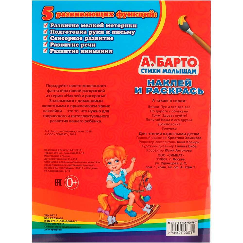 Раскраска «А. Барто. Стихи Малышам» из серии «Наклей и раскрась» ТМ «УМка».