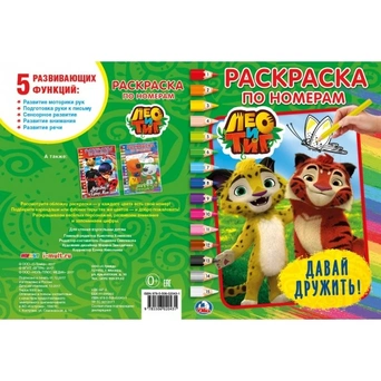 Раскраска по номерам - оригинальный подарок юным художникам. Она содержит крупные рисунки, которые несложно раскрасить. Нужно рассмотреть обложку раскраски - у каждого цвета есть свой номер. Необходимо подобрать карандаши или фломастеры тех же цветов и можно начинать творить. Раскрашивание полезно для малышей. Они получат представление о форме и цвете, освоят навыки владения карандашом и кистью, познакомятся с различными материалами для раскрашивания. В процессе раскрашивания происходит тренировка коррдинации рук и мелкой моторики, что важно для полноценного развития ребенка. А еще - это отличный способ занять малыша и весело провести время.