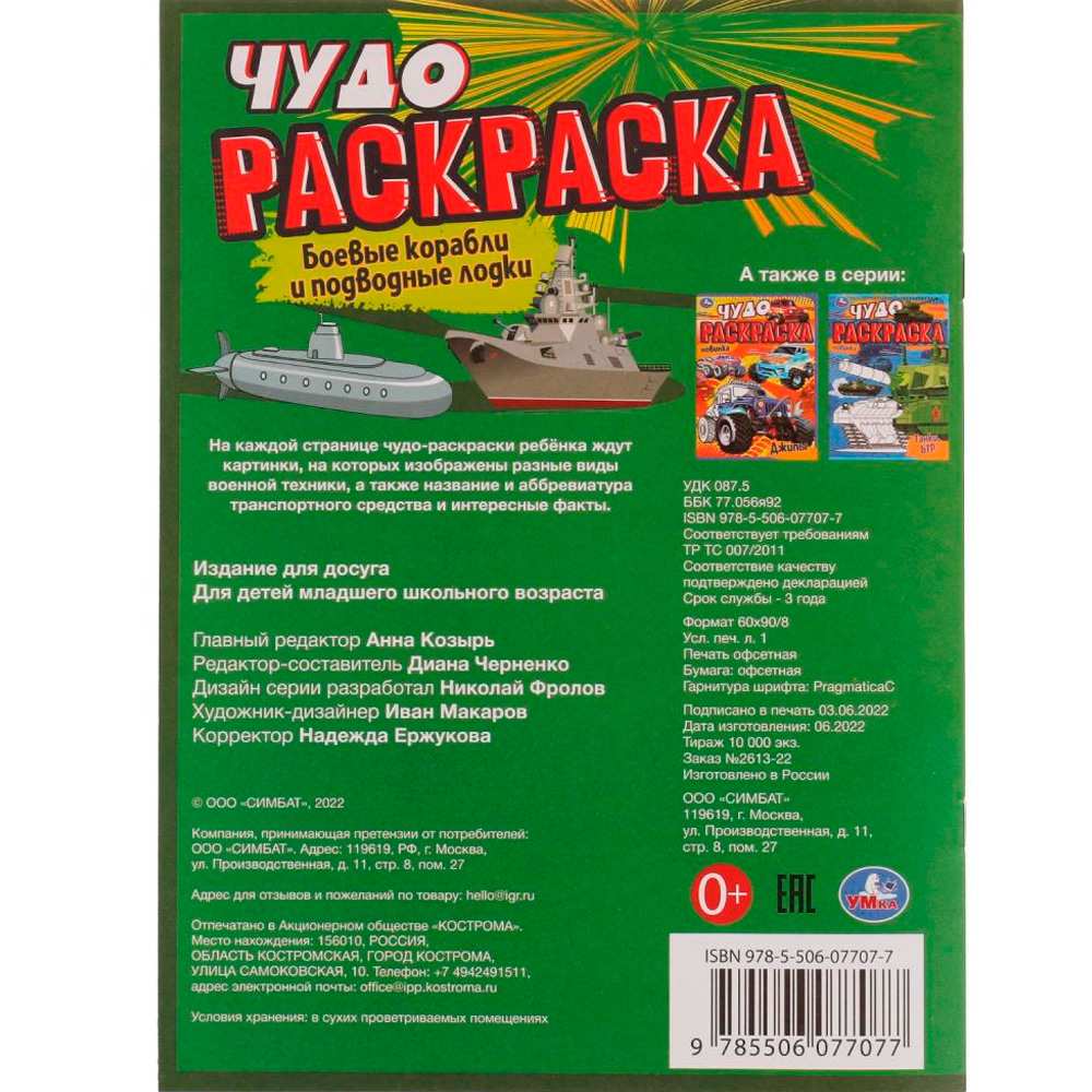 Возраст ребенка: Рекомендовано детям от 2 лет. Пол: мальчики. На каждой странице чудо-раскраски ребёнка ждут картинки, на которых изображены разные виды военной техники. Под картинкой находится название и аббревиатура транспортного средства, а также интересные факты о военной технике.