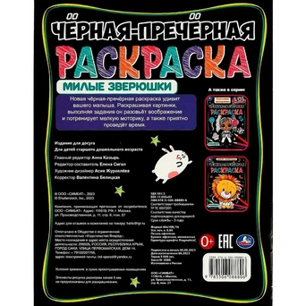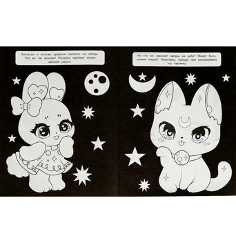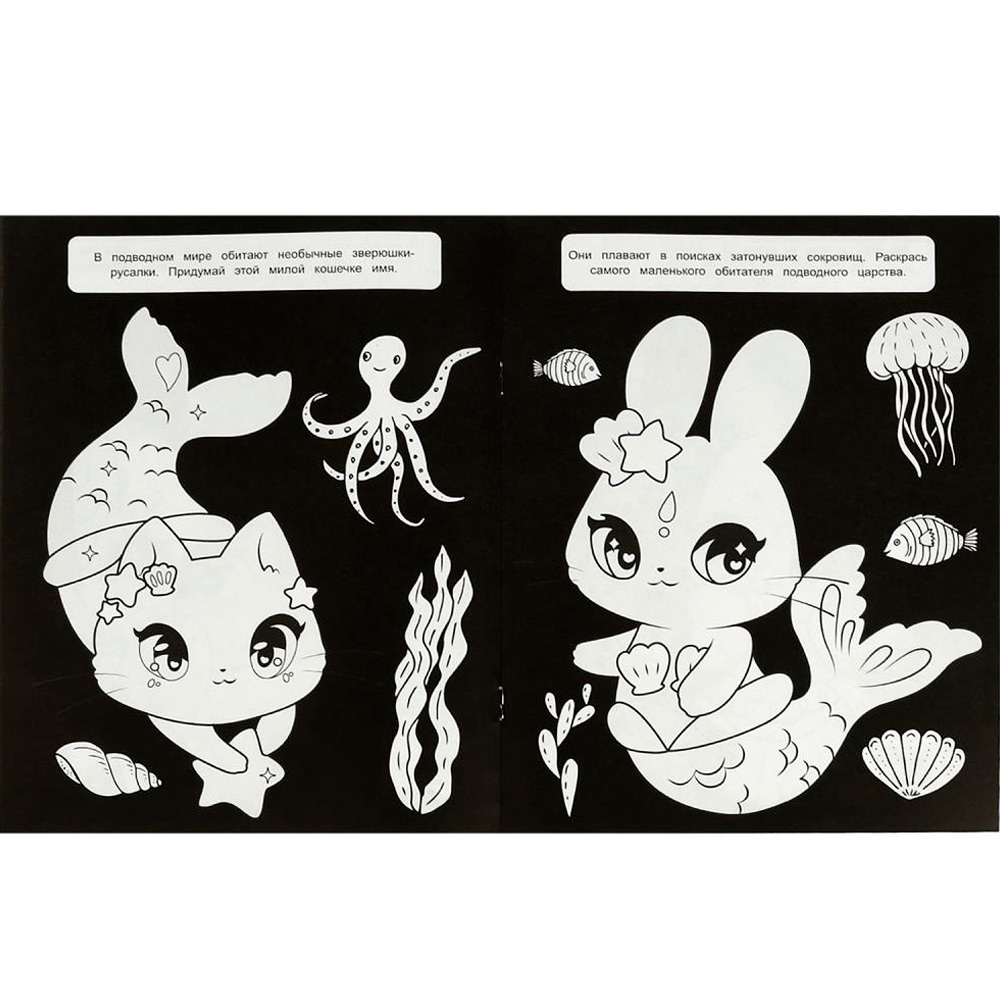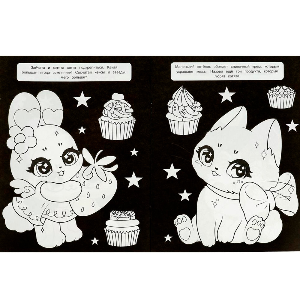 Это необычная раскраска: все странички у нее черные, только рисунок, который надо раскрасить, белый.