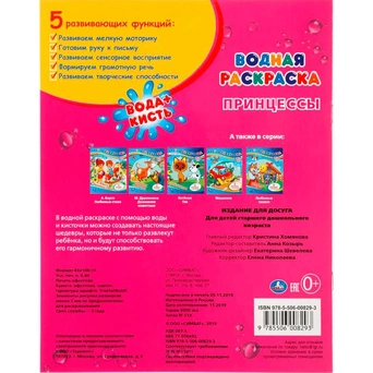 Водная раскраска со сказкой - прекрасная альтернатива краскам, ведь такое раскрашивание требует только кисть и воду и не оставляет следов. В процессе раскрашивания картинок водой проступают яркие цвета. Такое чудесное преображение точно понравится малышам. Такие книжки удобно брать в дорогу. Книга содержит 8 картинок для раскрашивания и сказку.