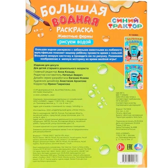 - Особенности: раскрашивание водой, короткие тексты, забавные персонажи, плотная бумага