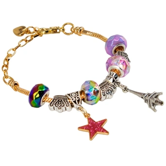 Браслет имеет стильный дизайн и будет аккуратно смотреться на ручке. Изделие украшено разноцветными шармами и оригинальными кулонами-подвесками. Застегивается на крепкий замочек. Носить браслет можно с любой одеждой.