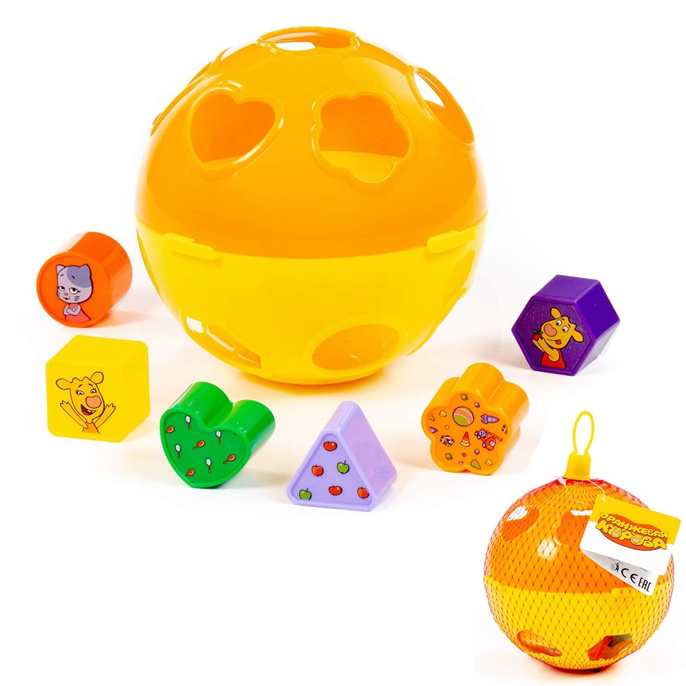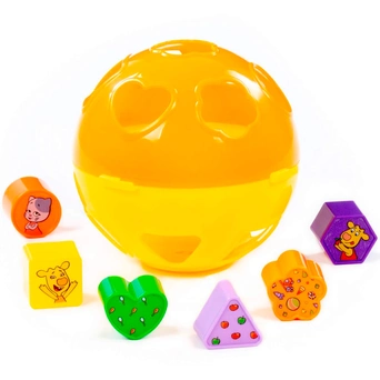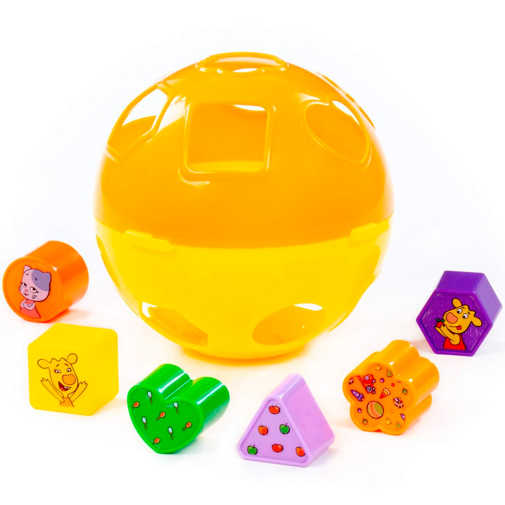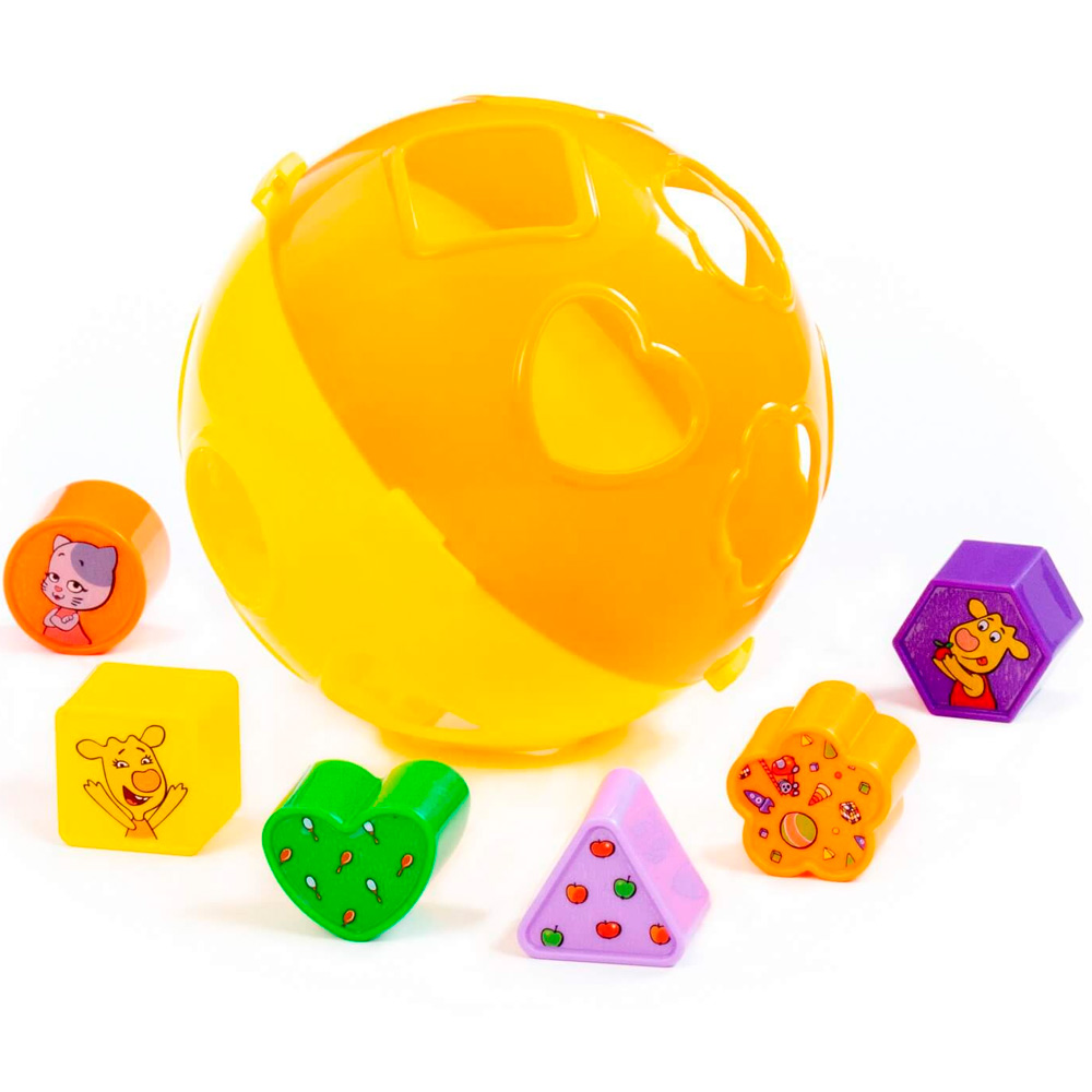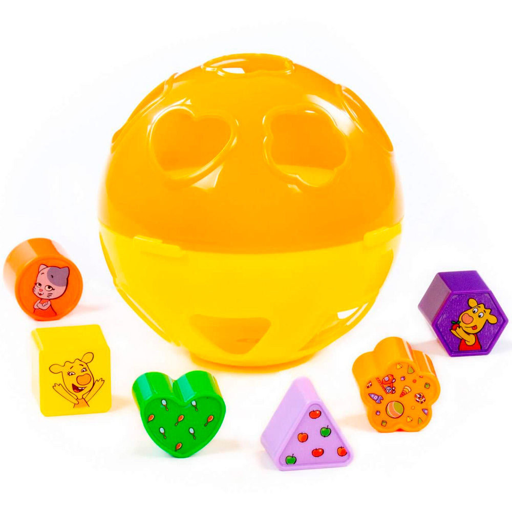 Комплектация: шар с отверстиями, 6 фигур (круг, квадрат, сердечко, треугольник, цветочек, многоугольник)