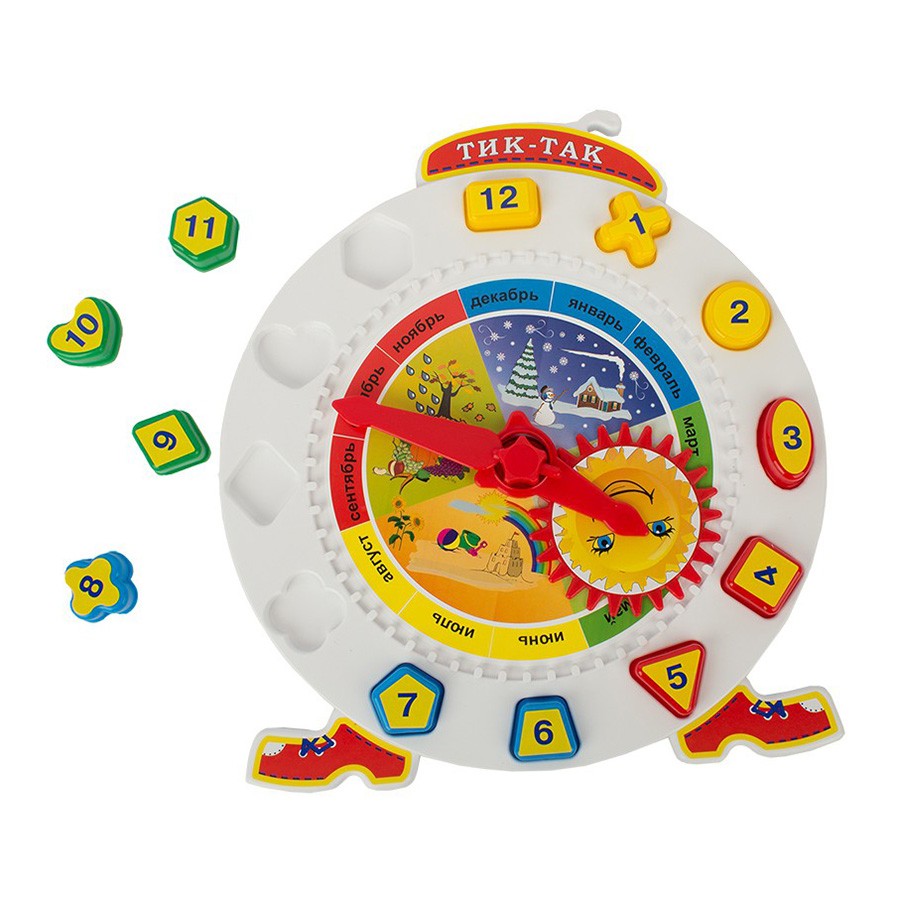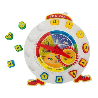 Познавательная игра «Тик-Так» научит малыша многим полезным навыкам. На часах есть необычный циферблат, где каждая цифра нарисована на определенной фигуре и соответствует форме выемке на часах. Благодаря этому малыш сможет быстрее запомнить порядок цифр и вместе со стрелками, которые двигаются, научится определять время. В середине часиков расположен круг с временами года и названиями месяцев. Игра знакомит ребенка с понятием формы, цифры, развивает логическое и пространственное мышление, а часики с ножками и со счастливым солнышком внутри будто оживляют игрушку и помогают развить воображение.