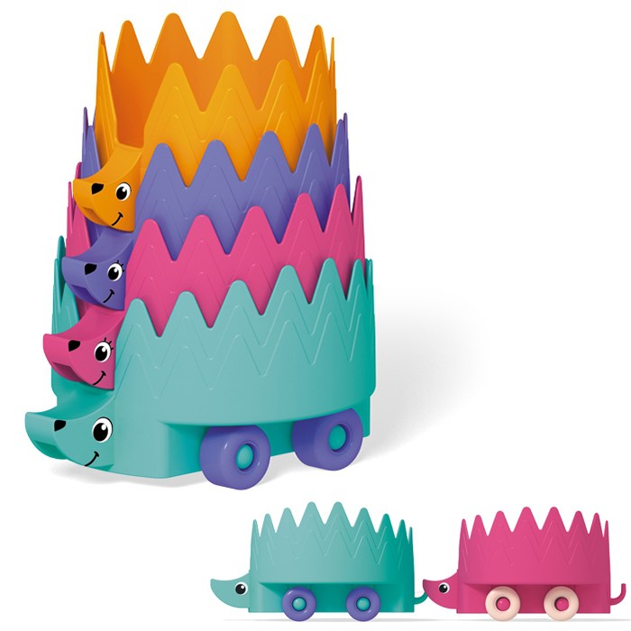 Оригинальный конструктор из цветных ёжиков разного размера предназначен для самых маленьких. Малыши смогут построить пирамидку, правильно подобрав ёжиков по размеру, или сложить их друг в друга. Также их можно соединить как поезд. Колесики можно использовать для обучения счету. В процессе игры ребенок познакомится с цветами, цифрами и счетом и понятием размера, большого и маленького, научится сравнивать. Такие игрушки оказывают всестороннее влияние на гармоничное развитие малыша: умственное, зрительное, речевое.