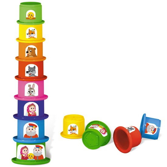 Это яркая и увлекательная пирамидка, в виде разноцветных стаканчиков, на которых изображены герои сказки «Колобок».