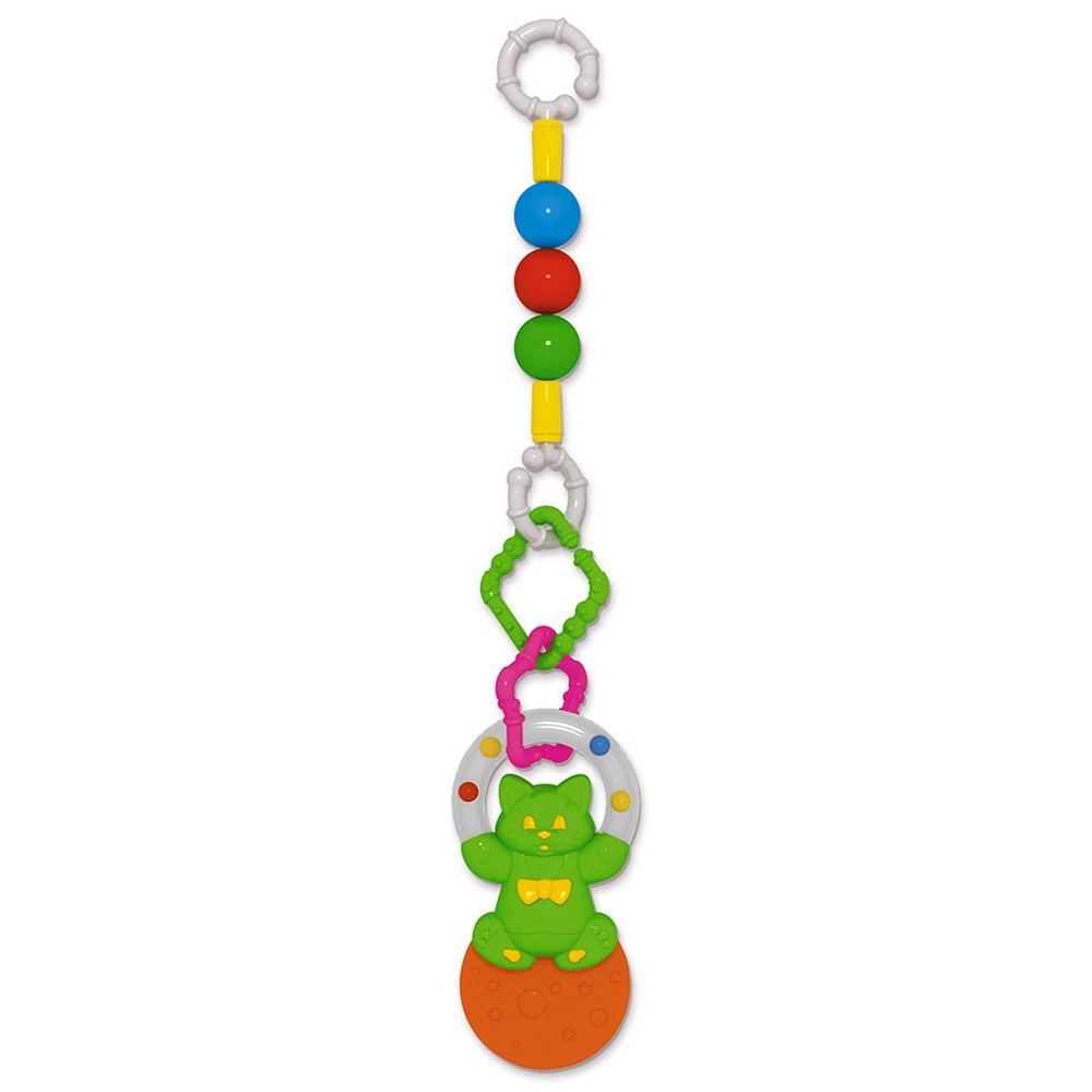 Красочная подвеска с яркими элементами и фигуркой котика - это замечательный подарок для малыша. Погремушку можно прикрепить на коляску или кроватку - для этого предусмотрены специальное крепление. Игрушка разбирается, что будет интересно малышам постарше. Также она издает звук от находящихся внутри элементов.