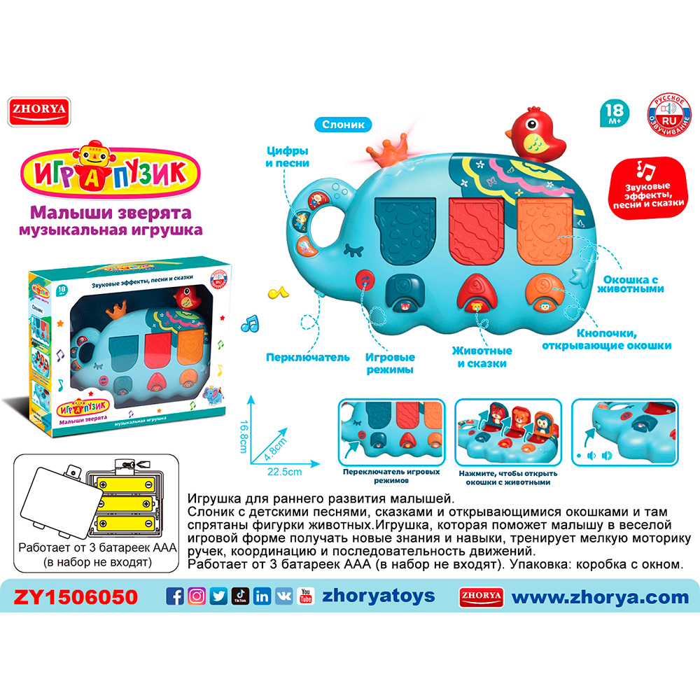 Музыкальная игрушка оборудована кнопками, нажимая на которые можно прослушать песни и сказки.
