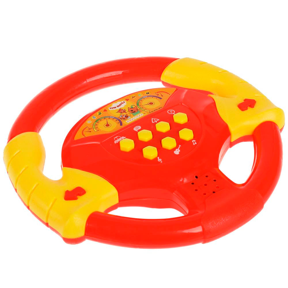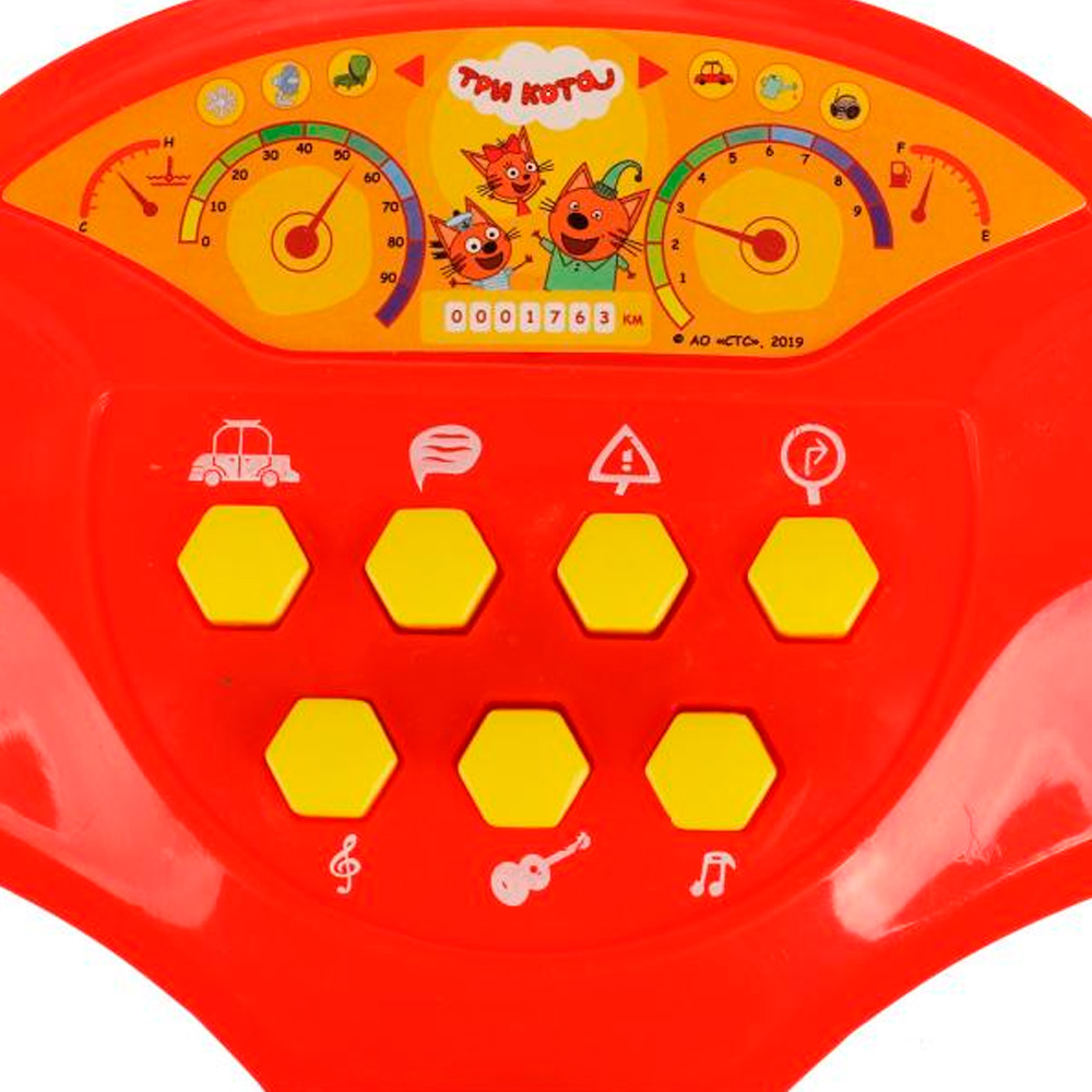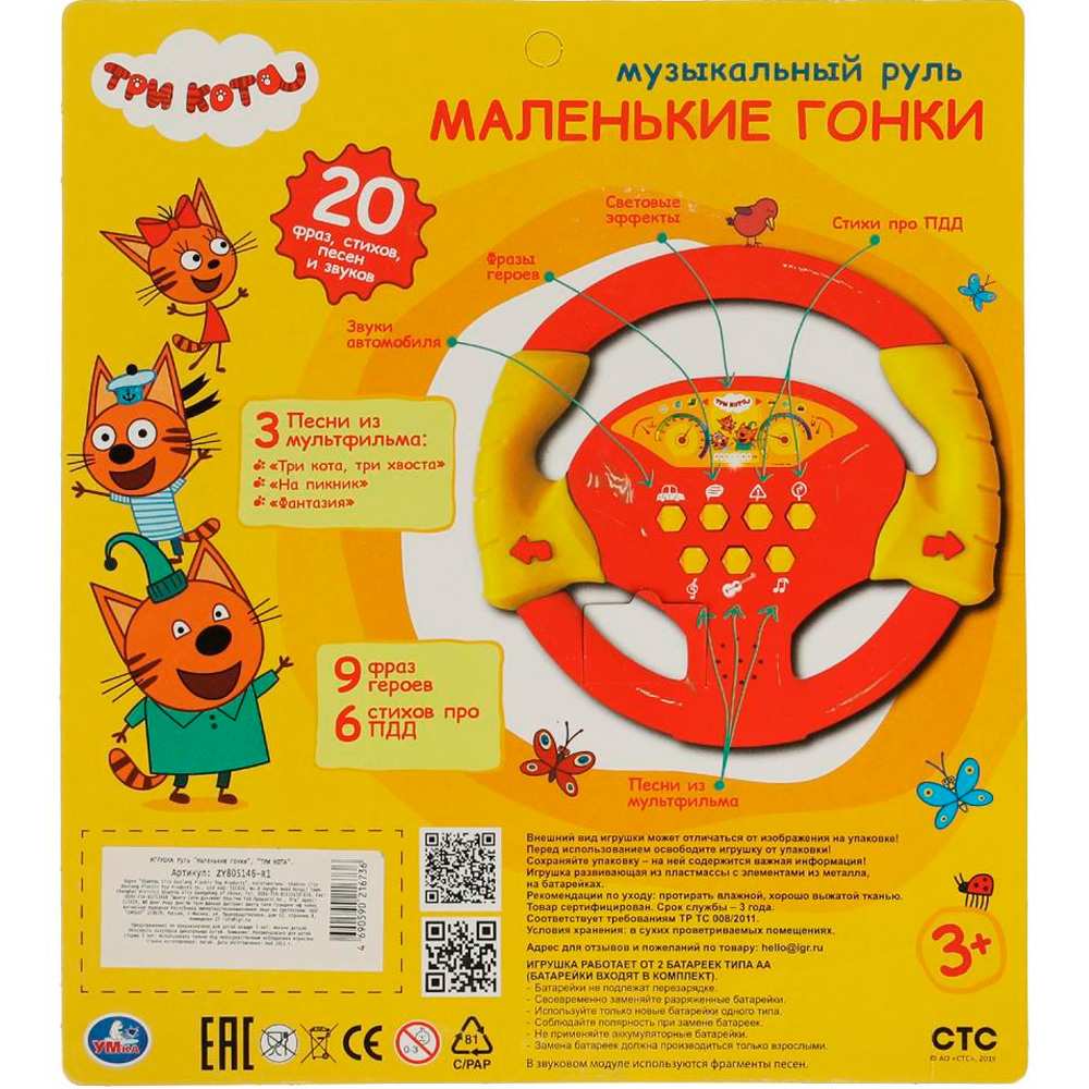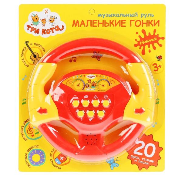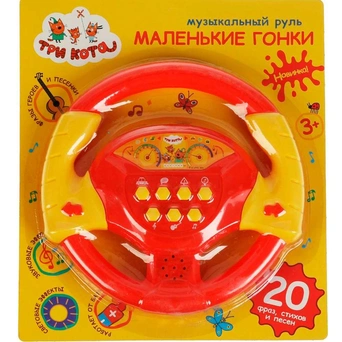 Музыкальный руль с любимыми героями мультфильма "Три кота". Оригинальная музыкальная игрушка Руль предназначена для активных игр и развития мелкой моторики и координации движений. Яркая расцветка развлечет малыша и привлечет его внимание. Руль оснащен кнопками, нажимая на которые малыш сможет услышать различные звуки и мелодии. Игрушка учит пониманию причинно-следственной связи, помогает тренировать моторику и координацию движений, восприятие формы и цвета. Игрушка привлекает внимание и способствует развитию тактильного, зрительного и слухового восприятия малыша. Игрушки сделаны из прочного и безопасного материала.