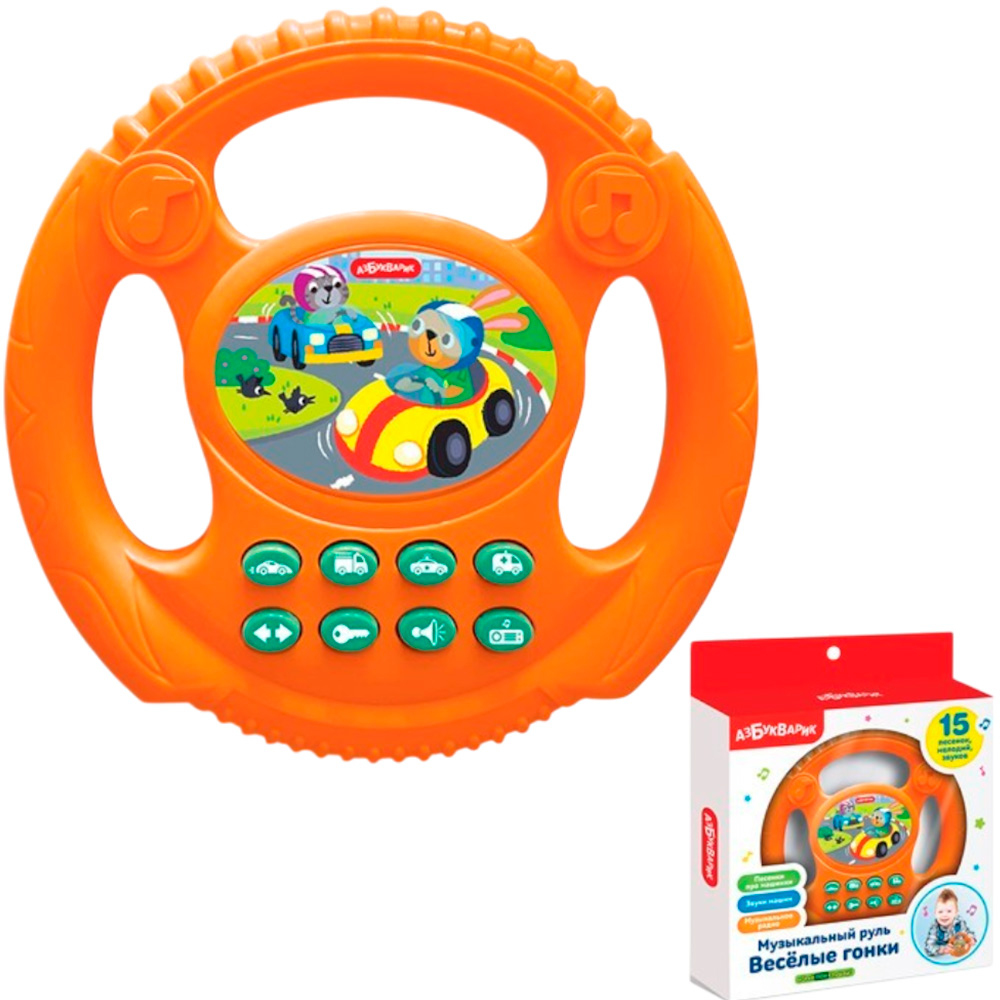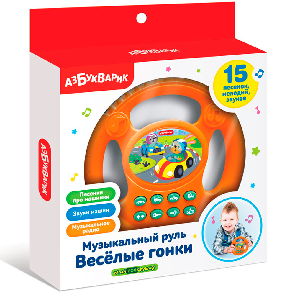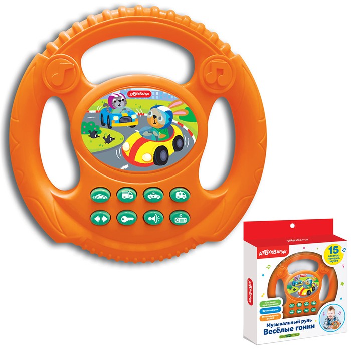 «Музыкальный руль. Веселые гонки» - отличный подарок для маленьких непосед! С этим рулем ребёнок почувствует себя настоящим водителем! Нажимая на кнопочки, малыш сможет завести мотор, посигналить, включить сигналы поворота, послушать 4 песенки про машинки и музыкальное радио – 3 забавные мелодии.