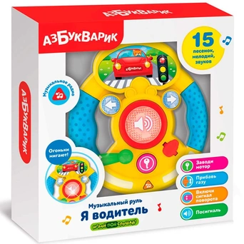 Руль оснащен кнопками, нажимая на которые малыш сможет услышать различные звуки и мелодии.