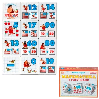 Игровой набор "Математика с рисунками" 00705 торговой марки Stellar - это кубики с цифрами. В комплект входят 12 кубиков с изображением занимательных картинок, цифр и арифметических действий. С помощью набора можно закрепить и расширить знания детей. Такое занятие положительно сказывается на всестороннем развитии ребенка: тренируется память, сообразительность, пространственное и образное мышление, координация и моторика рук. Кубики – простая, но многофункциональная игрушка. Кроме того, кубики можно использовать для строительства обычных башенок и домиков.
