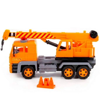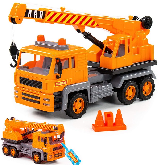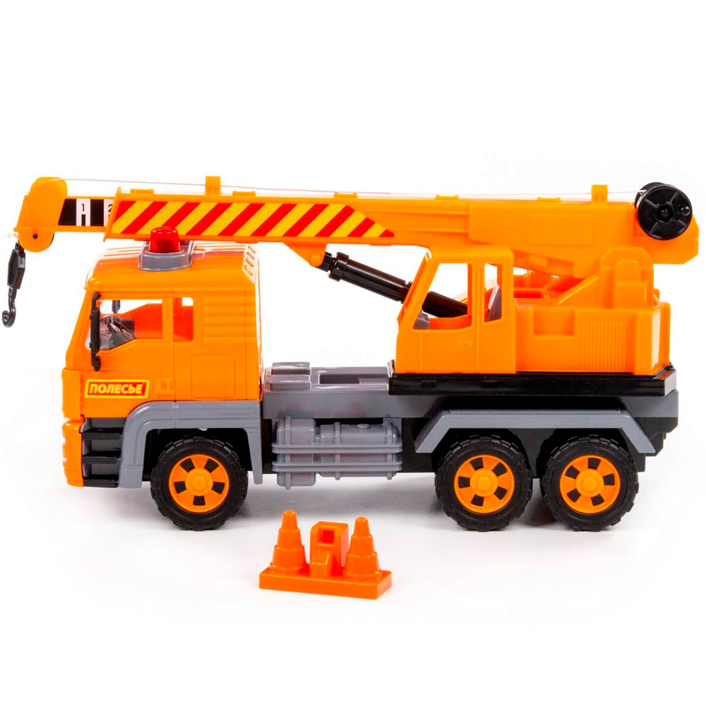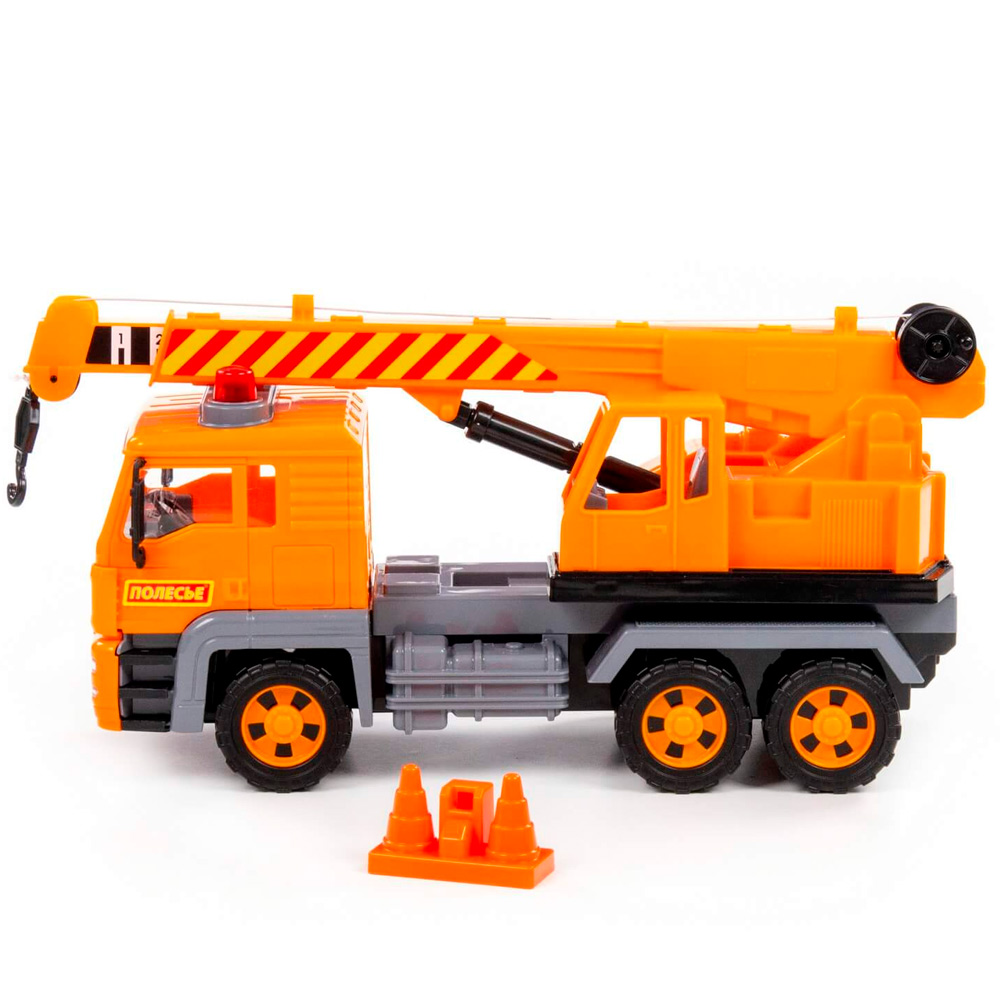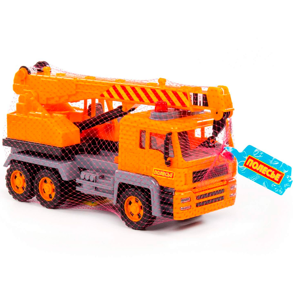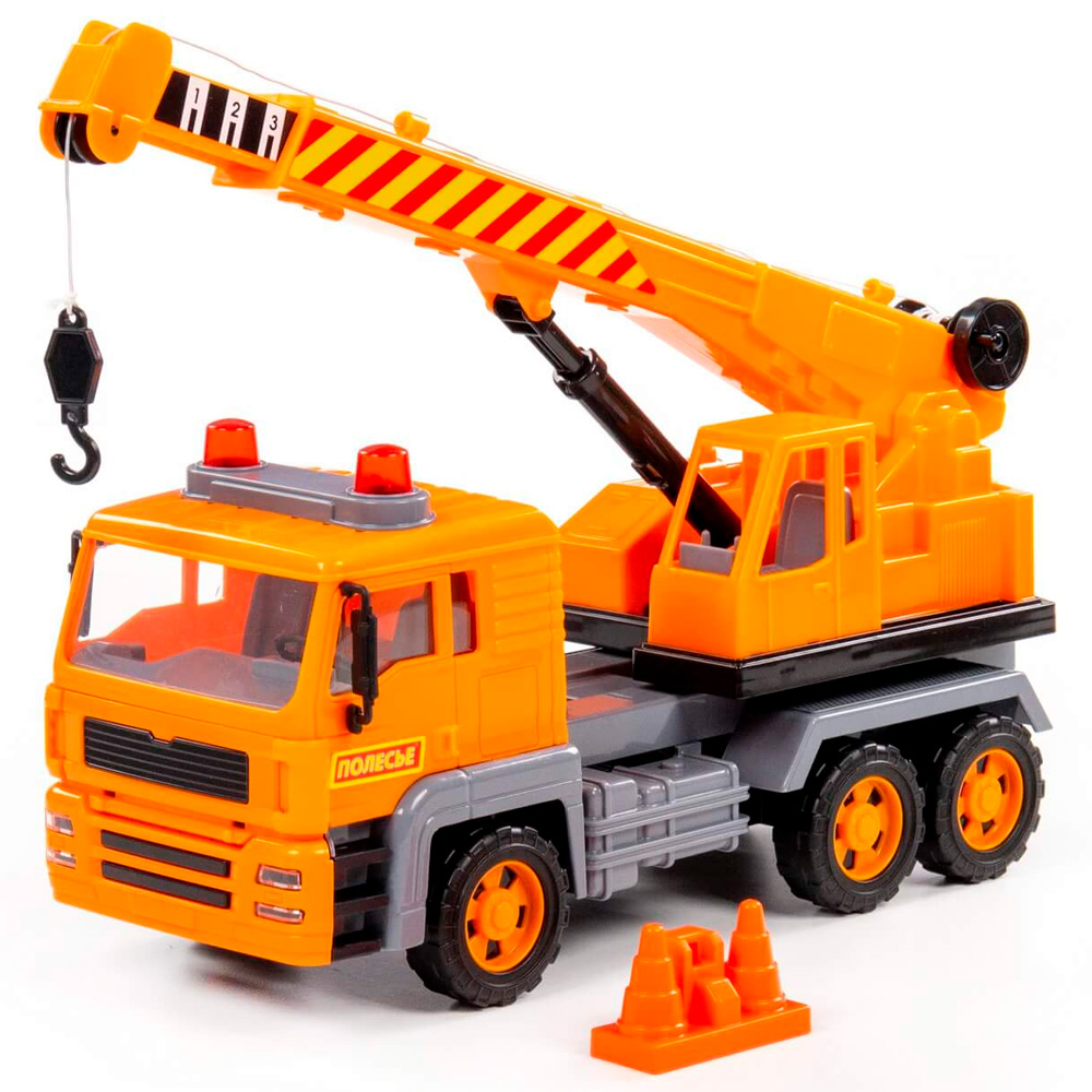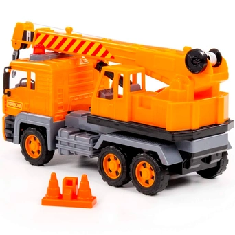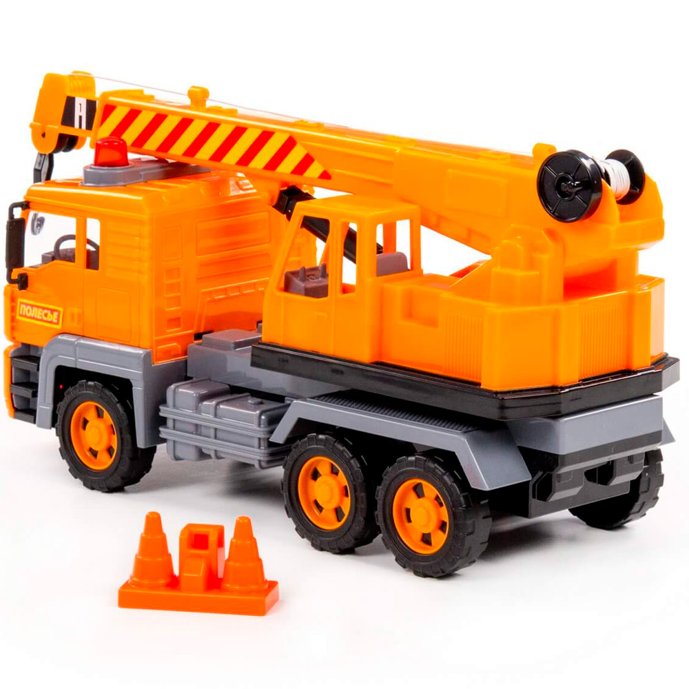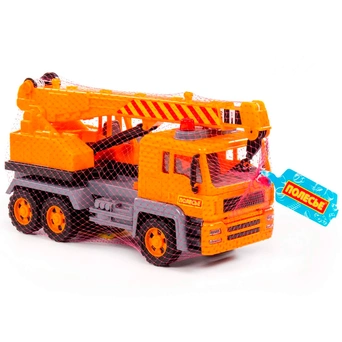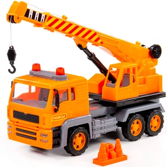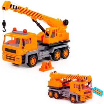 Автомобиль-кран из серии "Алмаз" имеет максимальное сходство со своим прототипом - настоящей строительный техникой. Автомобиль оснащен инерционным механизмом, благодаря которому может преодолевать некоторое расстояние по ровной прямой поверхности, если потянуть его назад и отпустить. Кроме того, игрушка оснащена подвижной поворотной платформой и выдвижной стрелой с крючком-подвесом и ручным механизмом, что сделает игру еще более интересной.