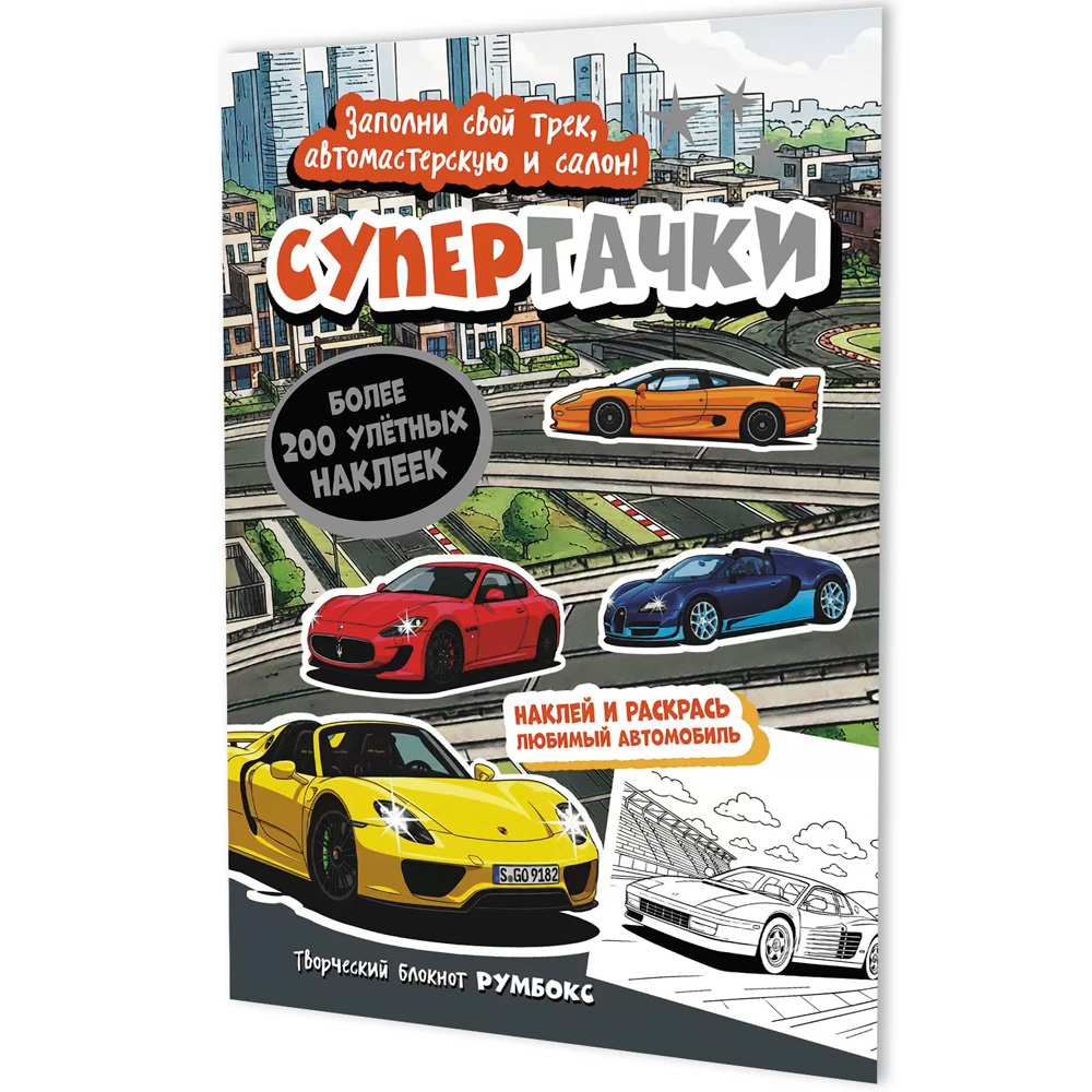 - множество наклеек с изображениями самых крутых и популярных автомобилей XX и XXI века! Также внутри вы найдёте 6 интересных локаций, куда можно наклеить стикеры и заполнить автомобилями любимых марок гоночный трек, автосервис или даже целый городской квартал!