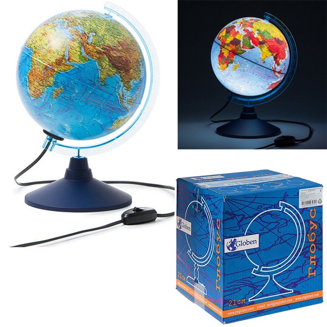 Макет глобуса Земли от компании "Глобен" с картой мира - эффектное и практичное дополнение к ученическому рабочему месту. Глобус отличает качественная полиграфия, приятная цветовая гамма и детальная прорисовка рельефов. Важной особенностью является наличие встроенной подсветки, которая функционирует от электросети: глобус оснащен проводом оптимальной длины с розеткой и удобным переключателем. Макет Земного шара, традиционно наклоненный под углом 70° и закрепленный на устойчивой пластиковой подставке, впишется в любой уголок интерьера.