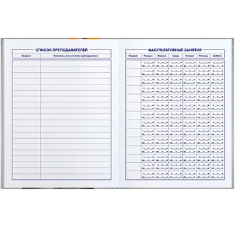 - разделение по дням недели, поля для заполнения расписания, домашнего задания и проставления оценок;