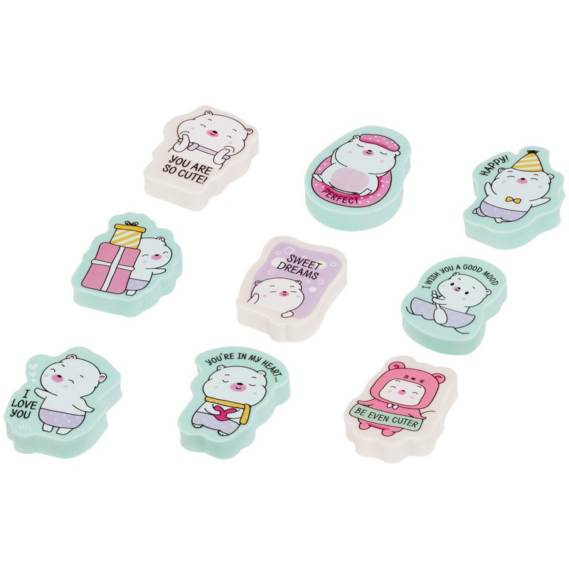 Ластики MESHU Cute – забавные помощники в школе, офисе и дома. Ластики фигурной формы выполнены из высококачественной термопластичной резины. Ассорти из 9-и весёлых дизайнов ластика белого цвета с рисунком милых котиков. Отлично стирают чернографитный карандаш. Ластики представлены в дисплей-боксе.