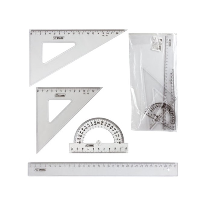 Комплектация: большой треугольник, линейка, малый треугольник, транспортирМатериал: пластик
