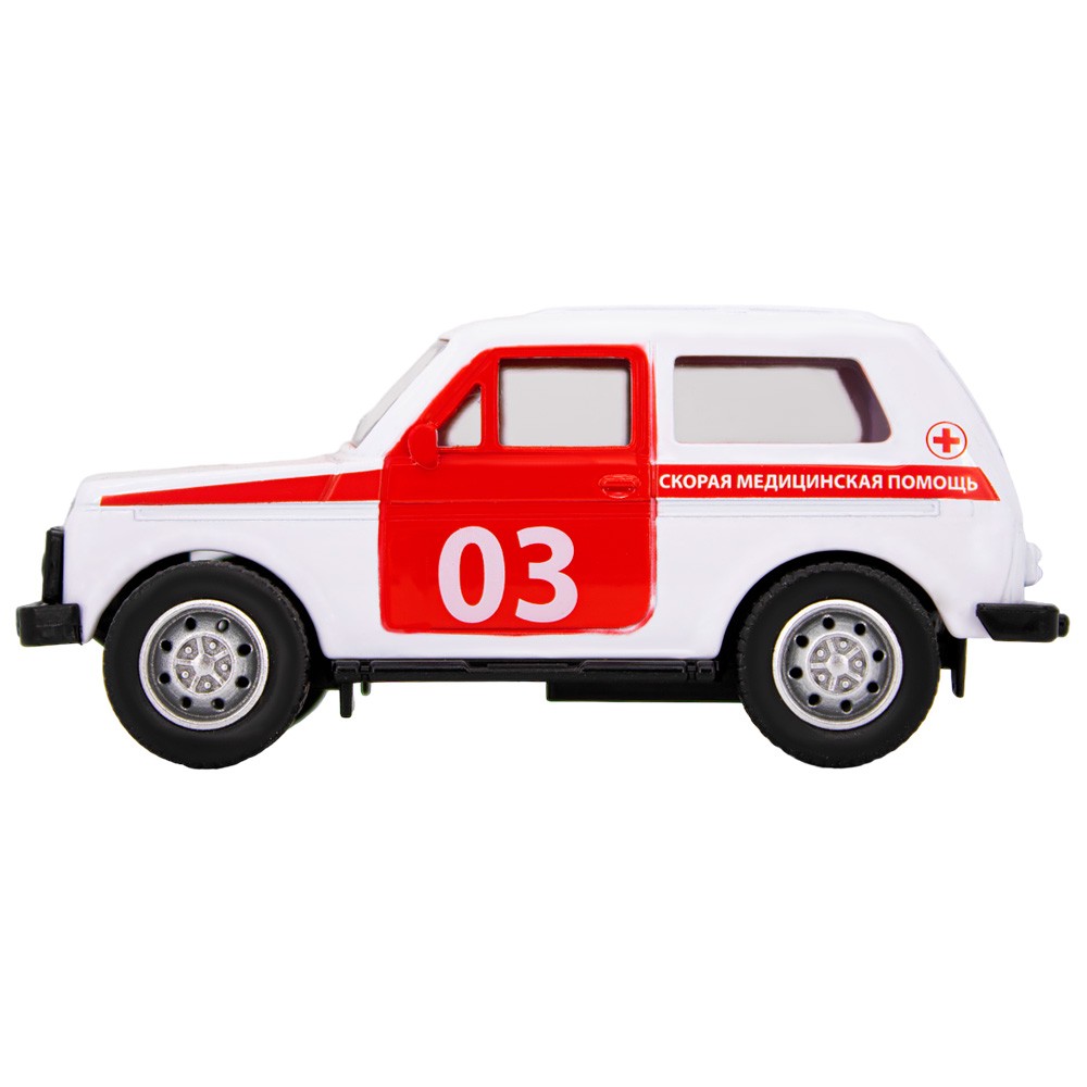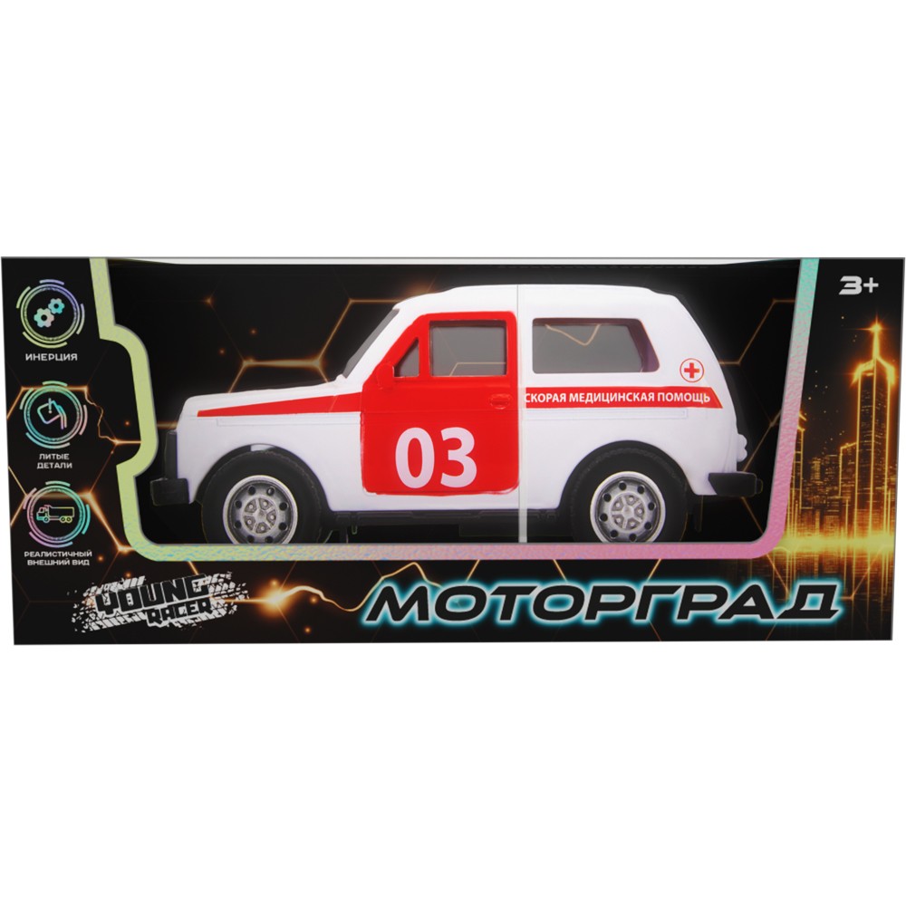 Яркая модель представляет собой копию автомобиля скорой помощи.
