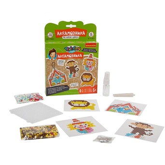 Комплект: набор бусин, пластиковая основа-планшет, распылитель воды, карточки-трафареты, пинцет, подвески для создания брелоков, самоклеящиеся глазкиМатериал: пластик, бумага