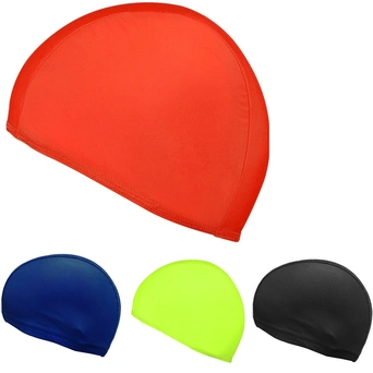 Яркая тканевая шапочка для плавания эластичная и не сдавливает голову, легко одевается и снимается, не причиняя вреда волосам.