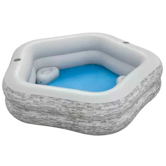 Семейный бассейн с двумя мягкими сиденьями и двумя подстаканниками предлагает все условия для комфорта и идеального отдыха.