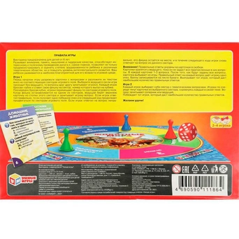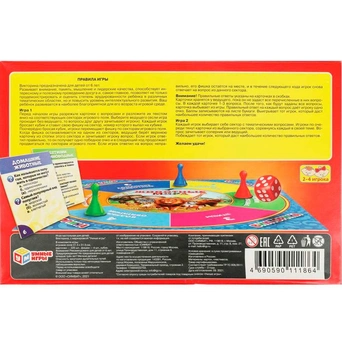 Комплектация: игровое поле, кубик, фишки, карточки с вопросами, инструкцияМатериал: картон, пластик, металл