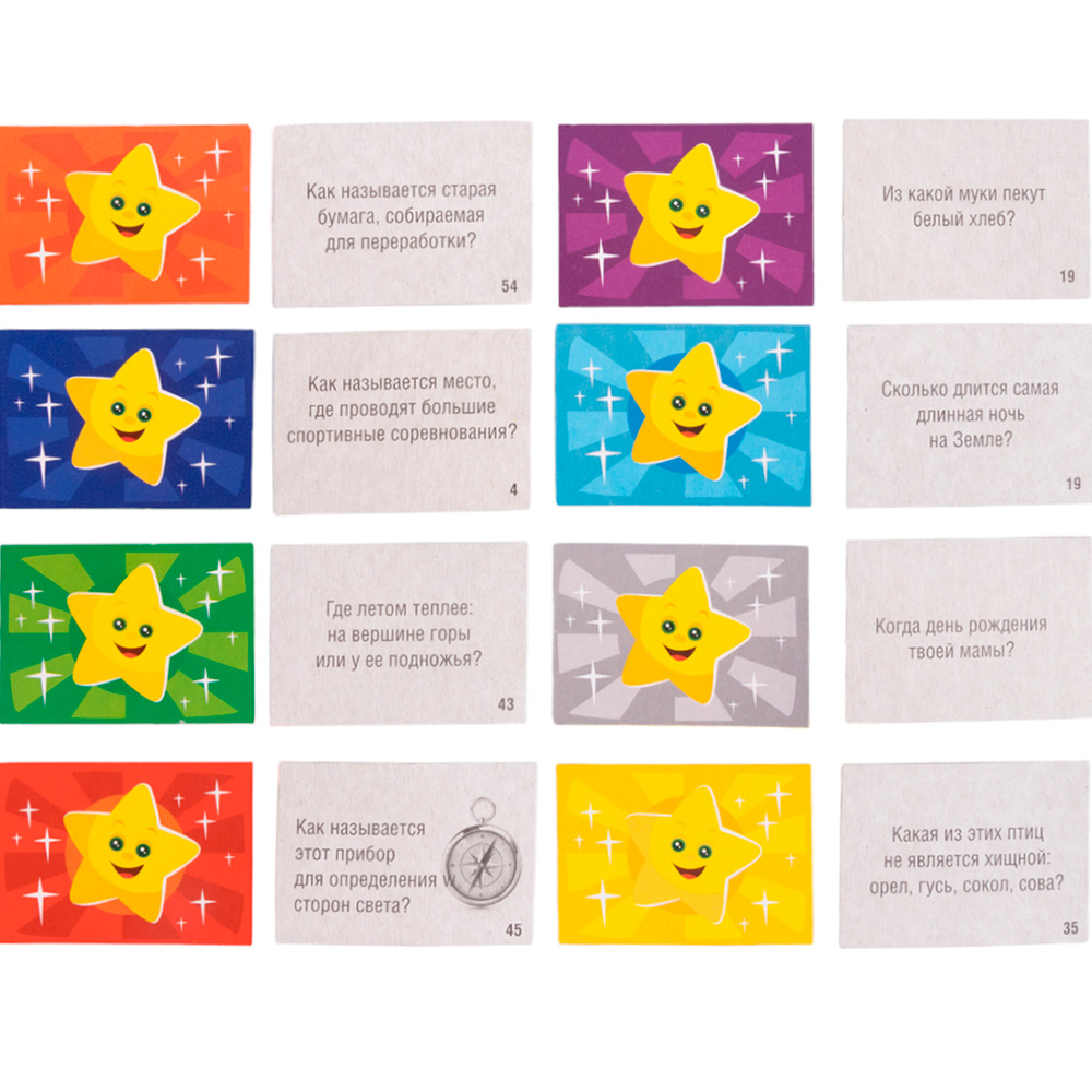 Красочная и яркая игра-викторина с карточками - прекрасный способ весело и с пользой провести время с друзьями и в кругу семьи. Красивые иллюстрации привлекут внимание ребенка. Оригинальная настольная игра поможет весело и интересно провести время. Такие игры помогут закрепить и проверить полученные знания, узнать новые интересные факты, сразиться в соревновании на эрудицию. Игра может использоваться индивидуально или в детском коллективе, при проведении тематических занятий. Все элементы игры выполнены из качественных и прочных материалов, окрашены безопасными нетоксичными красками, устойчивыми к износу и выгоранию.