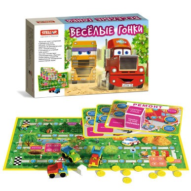 "Веселые гонки" - это динамичная игра, выполненная в стиле традиционных ходилок, где главная цель участников - первыми дойти до финиша, передвигая свою фишку по игровому полю. В процессе ребенок научится игре по правилам, научится достойно принимать победу и поражение. Качественное исполнени игры не оставит ребенка равнодушным - фишки участников выполнены в виде маленьких реалистичных грузовичков, а игровое поле красочное и яркое.