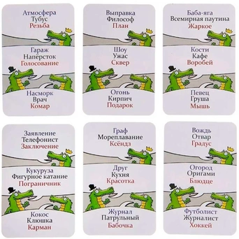 "Крокодил" - это весёлая игра для дружной компании, в которую можно играть везде: на детском празднике, дружеской встрече и в дальней дороге. Задача игрока: объяснять слова с карточек с помощью пантомимы. Тот, кто быстрее остальных покажет слова со своей карточки, побеждает. Игра отлично подходит для времяпрепровождения в дороге.
