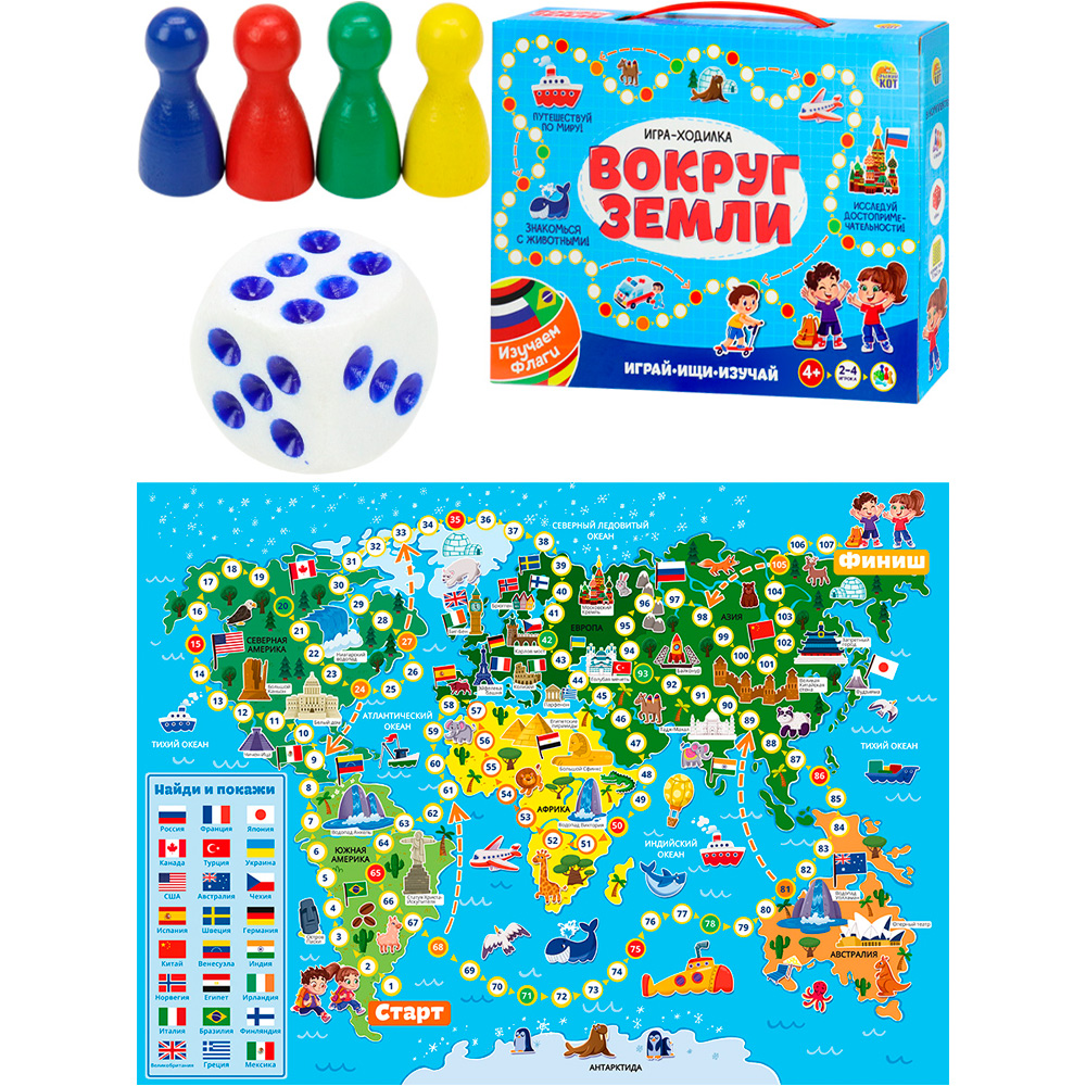 - В комплекте: игровое поле, 4 фишки, кубик, правила
