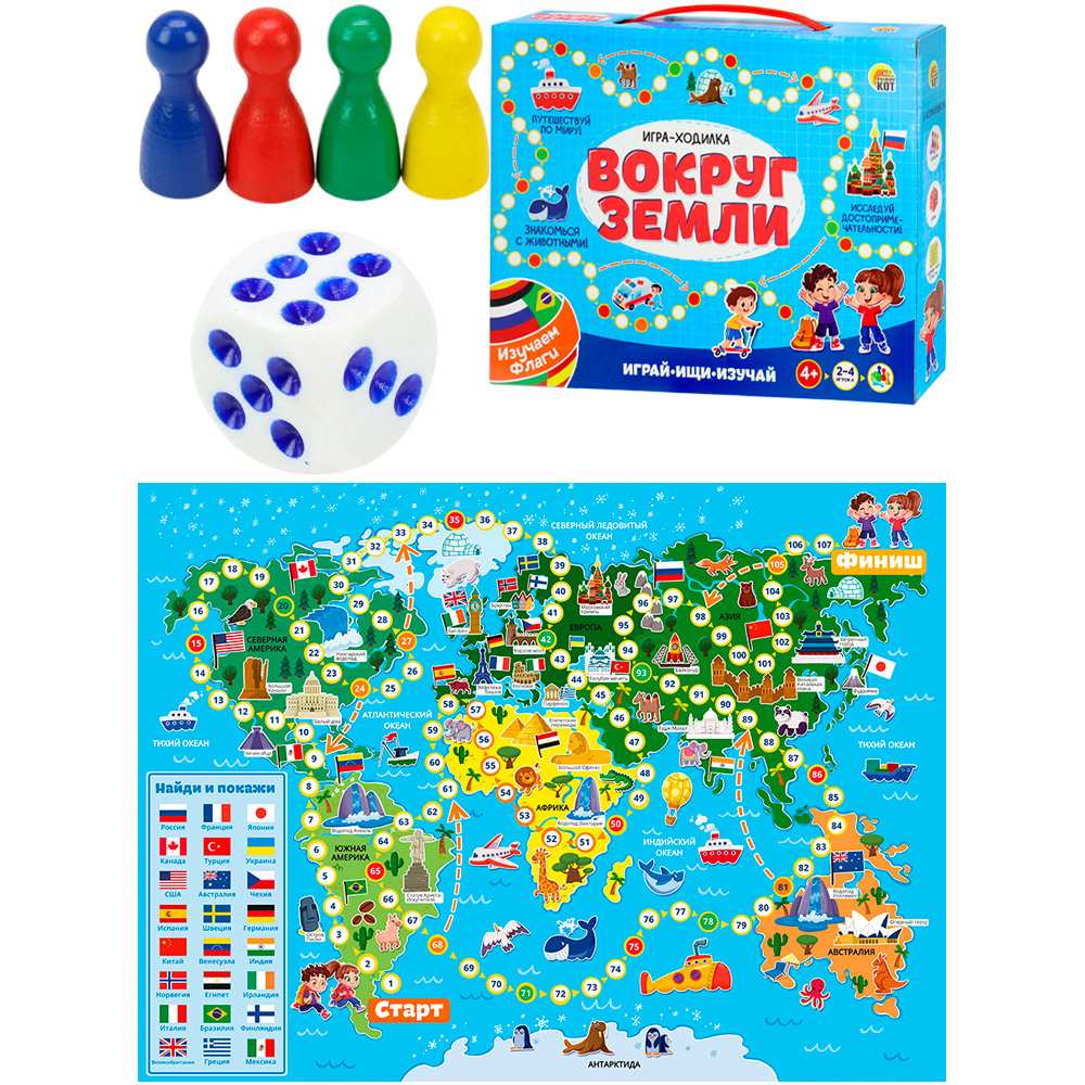 - Комплектация: игровое поле — 1 шт., фишки — 4 шт., кубик — 1 шт., правила игры