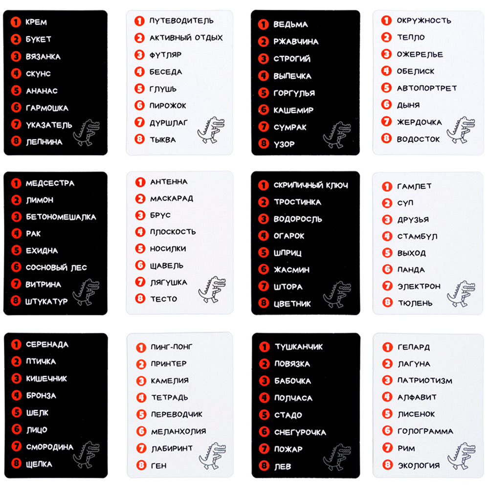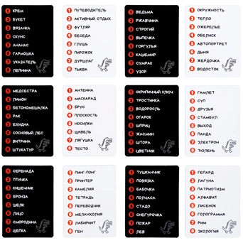 Комплектация: игровое поле - 1 шт, карточки - 128 шт, кубик - 1шт, фишки - 6 шт, песочные часы - 1 шт, правила