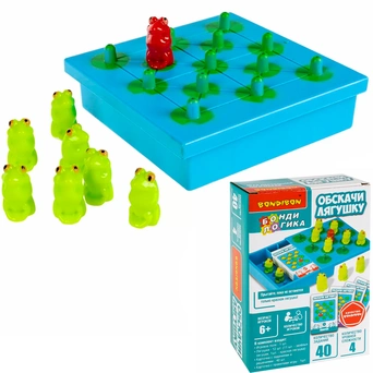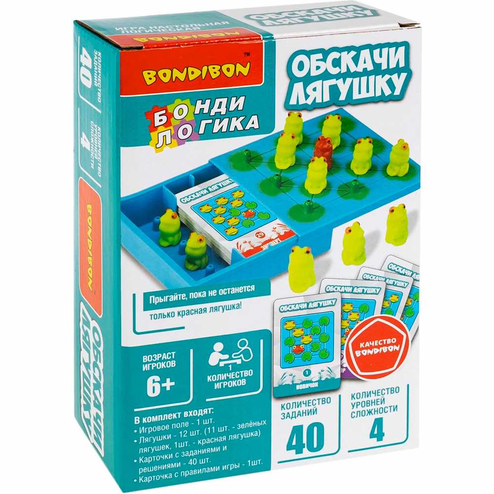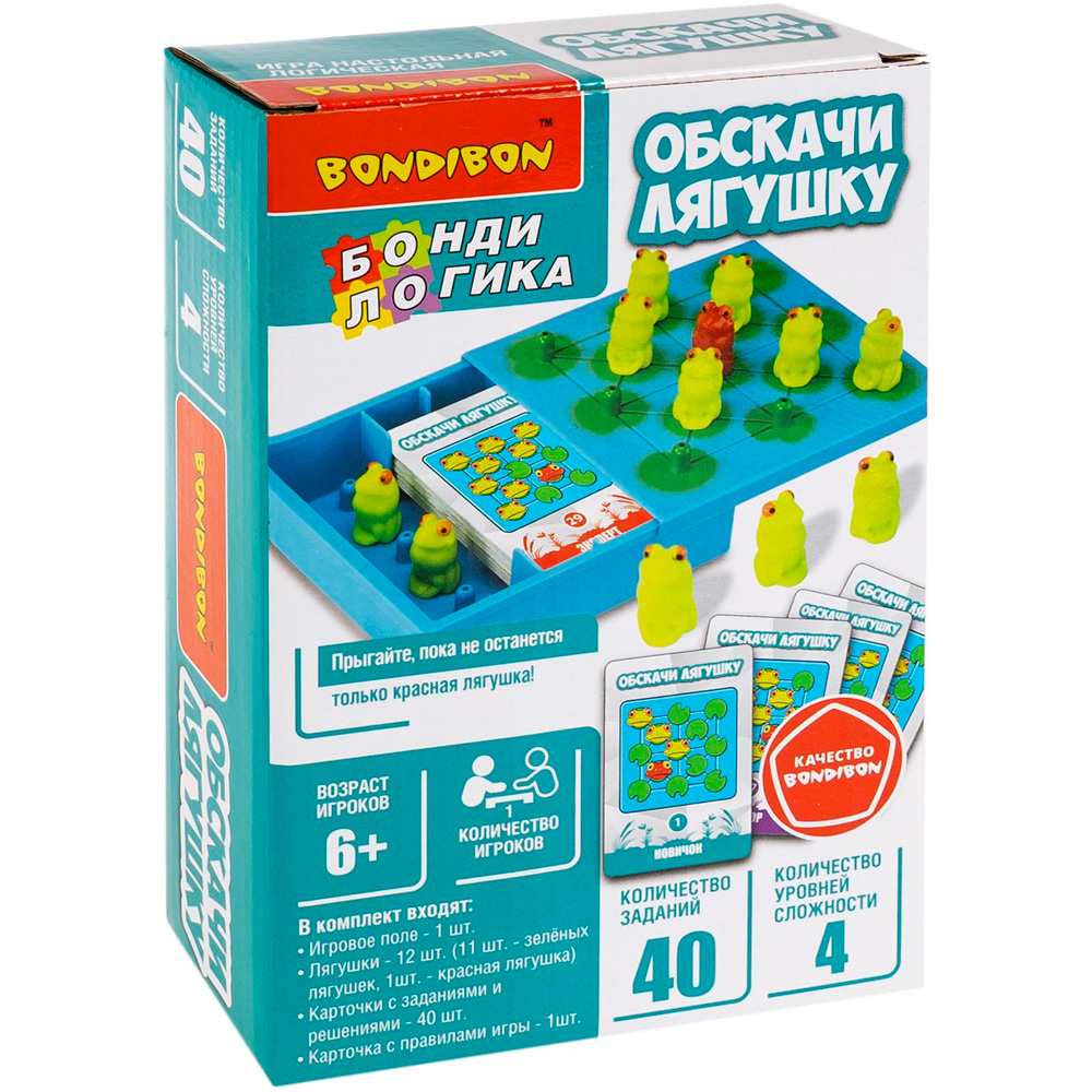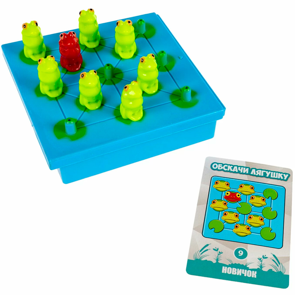 Комплектация: игровое поле, алая лягушка, 11 зеленых лягушек, 40 карточек с заданиями и решениями, карточка с правилами