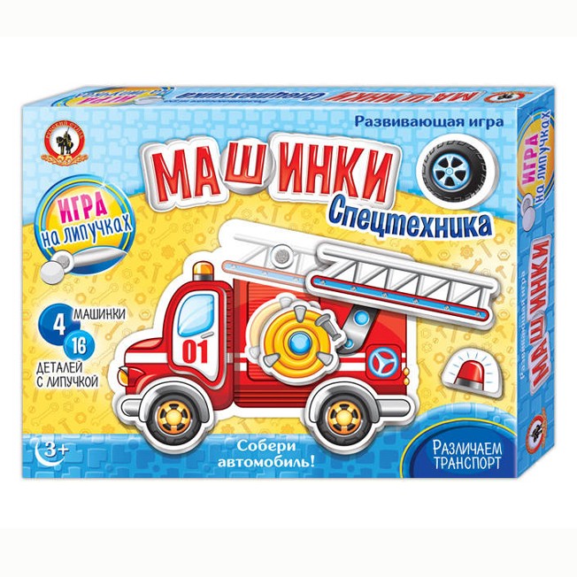 Игра на липучках "Машинки" поможет малышу познакомиться с основными видами спецтехники - используя 16 деталей, ребенок может собрать 4 разных автомобиля. Детали крепятся на специальное полотно с помощью липучек. Помимо того, что это занятие положительно сказывается на развитии моторики и пластики рук, ребенок узнает как выглядит, например, пожарная машина и какие функции она выполняет. Параллельно можно рассказывать, как следует вести себя в чрезвычайных ситуациях и куда следует звонить - эта полезная информация лучше запомнится, так как будет представлена в игровой форме.