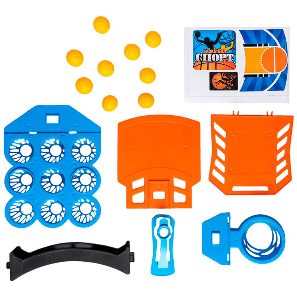 Комплектация: база - 1 шт., опора - 1 шт., катапульта - 1 шт., щит - 1 шт., мячи - 9 шт., кольцо - 1 шт., плата с корзинами - 1 шт., наклейки - 1 лист