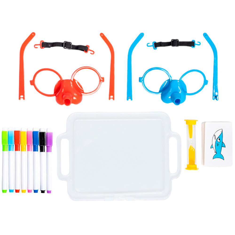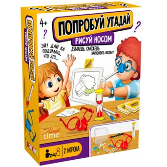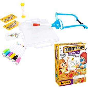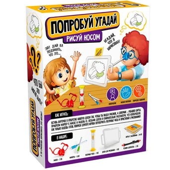 Комплектация: маска - 2 шт., заушники (длина 13 см) - 4 шт., резинка-держатель - 2 шт., цветные маркеры на водной основе - 8 шт., песочные часы - 1 шт., карты с заданиями - 54 шт., доска для рисования - 1 шт.