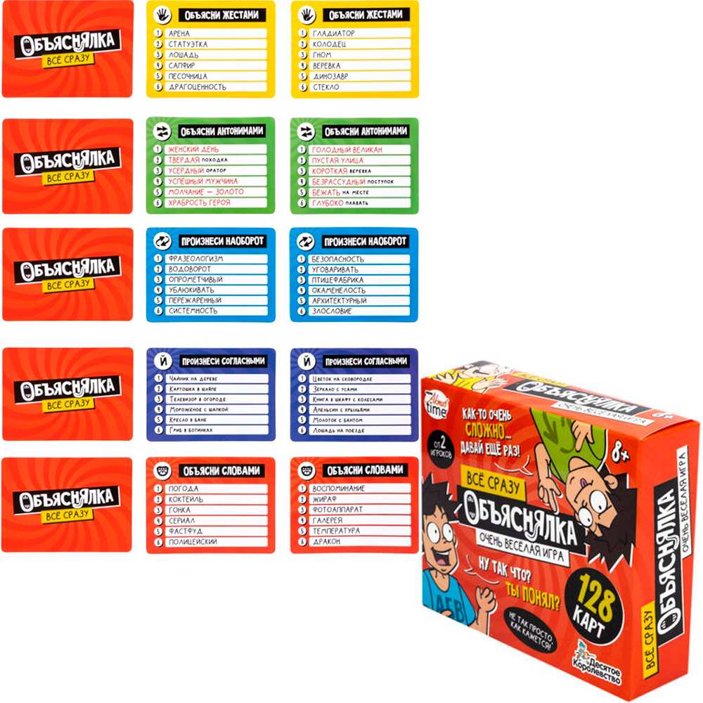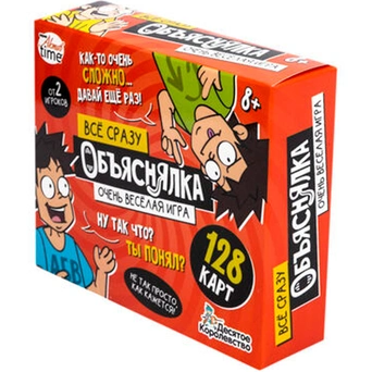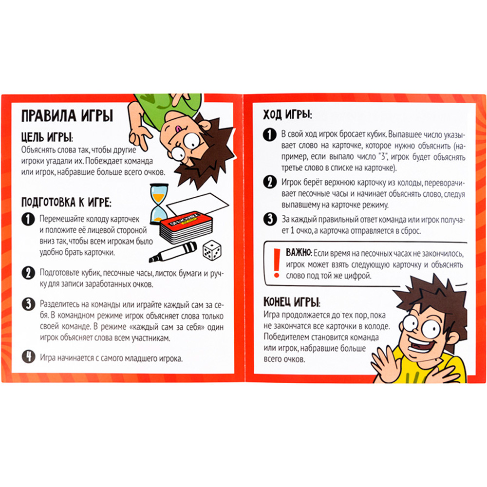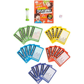 Комплектация: карточки с заданиями - 128 шт. ,игральный кубик - 1 шт., песочные часы - 1 шт., инструкция