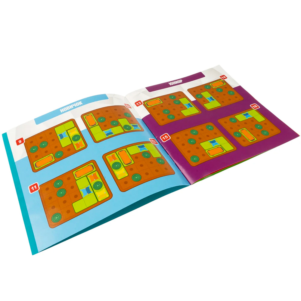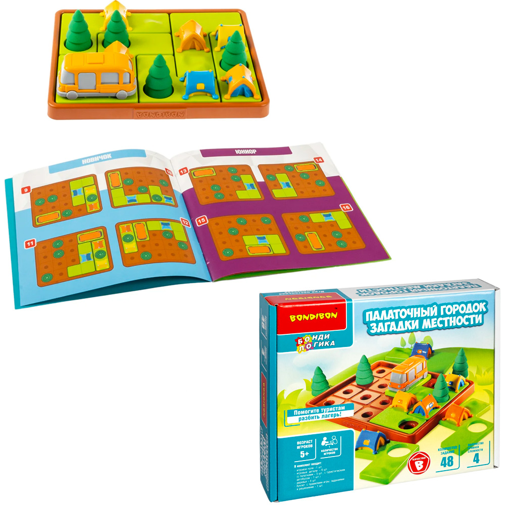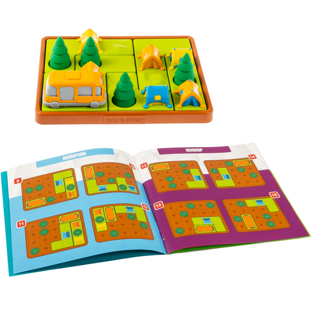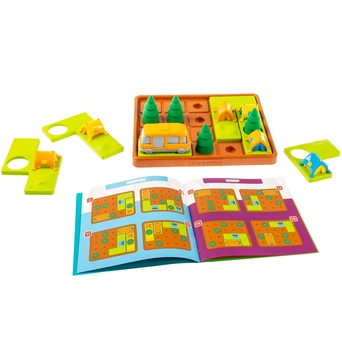 Комплектация: игровое поле, пазлы с палатками (5 шт.), автобус (1 шт.), деревья (4 шт.), буклеты с заданиями