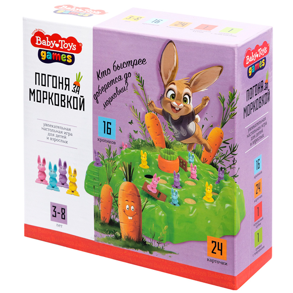 Комплектация: игровое поле - 1 шт., кролики - 16 шт., кубик - 1 шт., карточки - 24 шт.