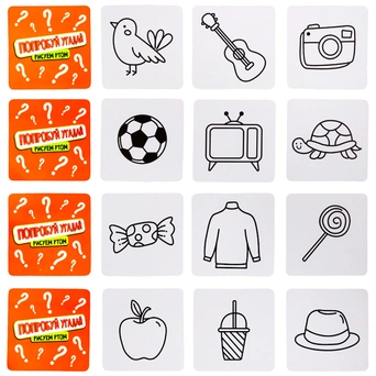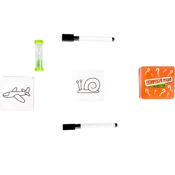 Комплектация: карточки с заданиями - 48 шт., экран для рисования - 1 шт., песочные часы - 1 шт., маркер - 2 шт., правила
