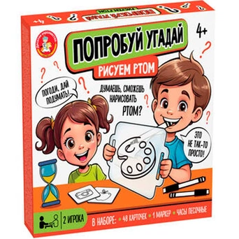 Суть игры: игра, где нужно рисовать, держа фломастер в зубах. Экран для рисования многоразовый, а маркеры легко стираются. Пока сыпется песок, нужно нарисовать картинку с карточки.