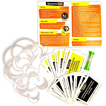 Комплектация: карточки с заданиями – 200 шт., загубники размера L – 6 шт., загубники размера XL – 4 шт., песочные часы – 1 шт.