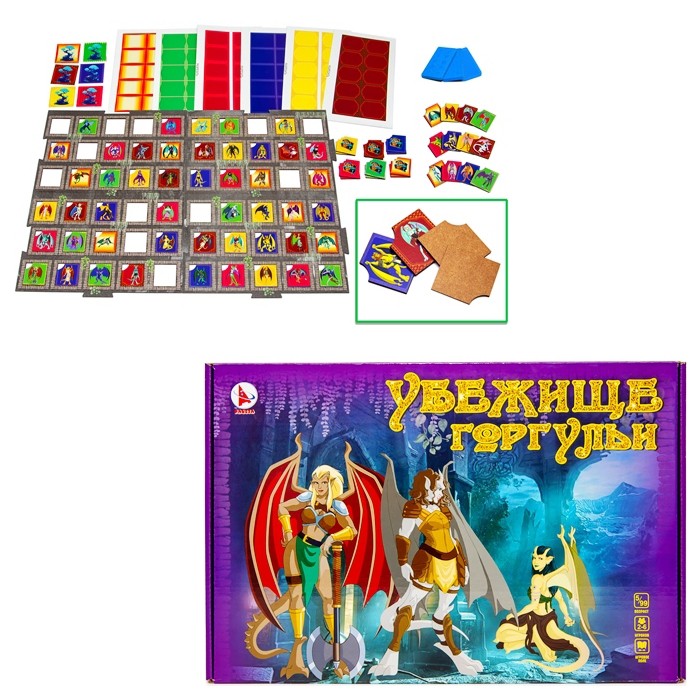 Комплектация: картонное поле с 60 пустыми нишами (69*49 см), 60 тайлов с горгульями, 6 цветов (4.3*4.5 см), 12 тайлов- сундучков с вредными пикси (4.3*4.5 см), 60 тайлов камней (4 пластины 32*22 см), 6 картонных тайлов ядовитых пучеглазых грибов, 6 цветов (6*6 см), 30 маркеров (d=1 см) из вспененного полимераМатериал: картон