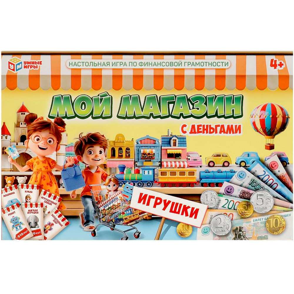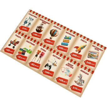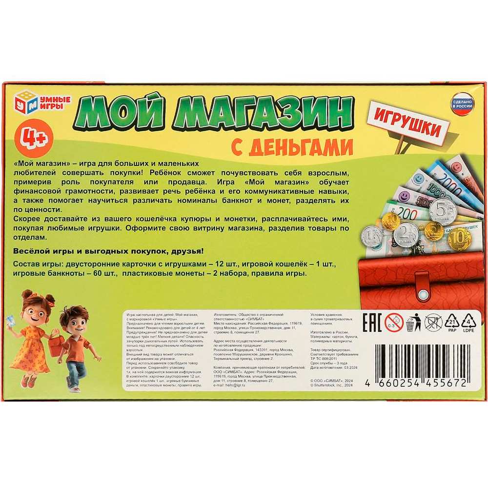 Комплектация: двусторонние карточки с игрушками - 12 шт., игровой кошелёк — 1 шт., игровые банкноты - 60 шт., пластиковые монеты - 2 набора, правила