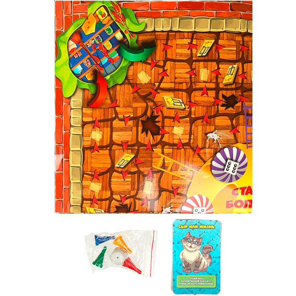 Комплектация: игровое поле, 10 карт «Сыр или жизнь», 6 карт «Хапни сыр», 6 карт «Большой забег», 6 карт «Двойной сыр», 36 фишек-кусочков сыра, 4 фишка, игральный кубик