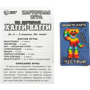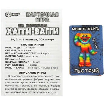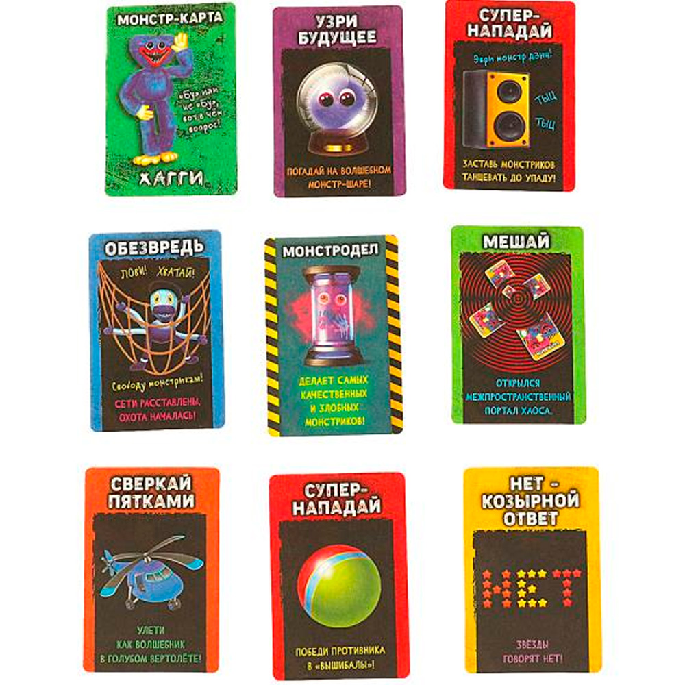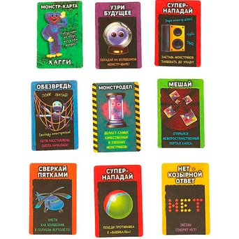 Комплектация: 4 карты МОНСТРОДЕЛ; 6 карт ОБЕЗВРЕДЬ; 4 карты НЕТ – КОЗЫРНОЙ ОТВЕТ; 4 карты СУПЕРНАПАДАЙ; 6 карт МЕШАЙ; 6 карт СВЕРКАЙ ПЯТКАМИ; 4 карты УЗРИ БУДУЩЕЕ; по 4 карты четырёх видов МОНСТР-КАРТА; правила игры.